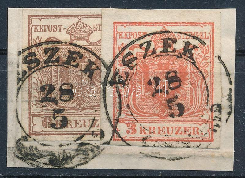 Leírás: 1850 3kr + 6kr I. tipusú bélyegek kivágáson lépcsős bérmentesítéssel "ESZÉK", friss darab