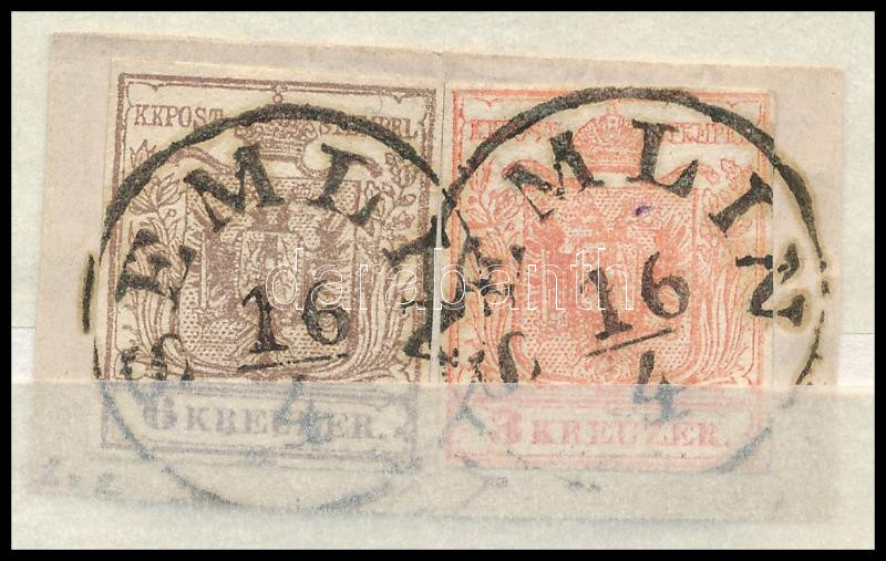 Leírás: 1850 3kr + 6kr MP III tipusok lilliputi vágással kivágáson "SEMLIN"