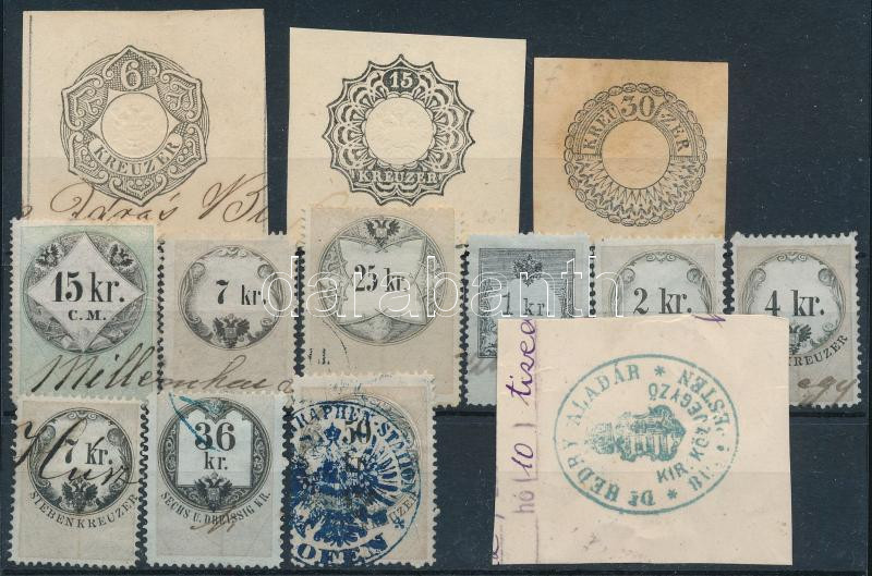 Leírás: 13 db osztrák-magyar okmánybélyeg, szignetta kivágás