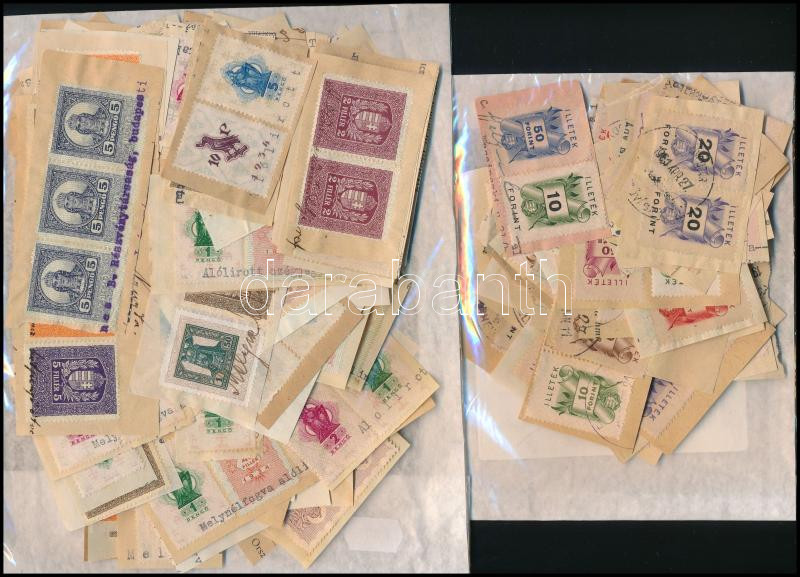 Leírás: Kb 350 db áztatni való okmánybélyeg a Pengő-fillér és a Forint-fillér időszakból