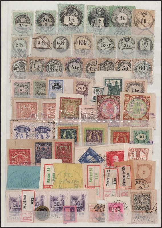 Leírás: Vegyes okmánybélyeg gyűjtemény, berakólapon, rajta Uti gyalog napszám, Uti szekeres napszám bárcák