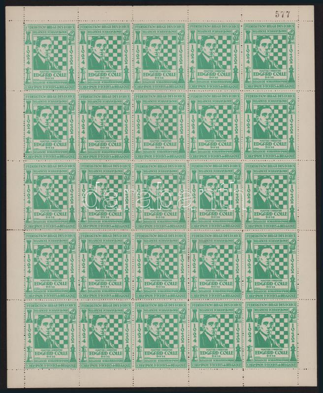 Leírás: 1932 Edgard Colle belga sakk levélzáró teljes ív / 1932 Edgard Colle Belgian chess poster stamp complete sheet