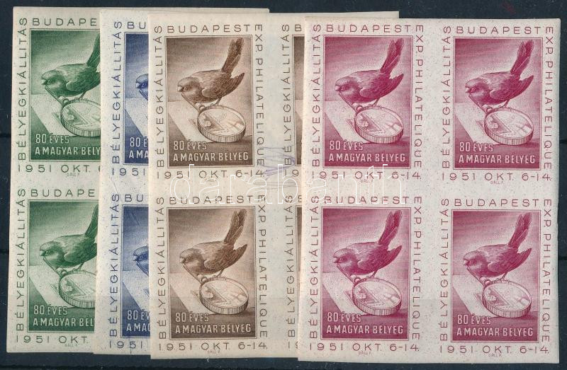 Leírás: 1951 80 éves a Magyar bélyeg mind a 4 klf színnyomatú levélzáró négyestömbben