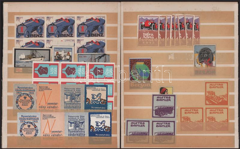 Leírás: ca 1910 Magyar levélzáró tétel 3 berakólap oldalon: Nyomtatvány vándorkiállítás, Benz, Auto Daimler, Tátra Adria túraút
