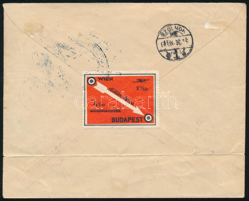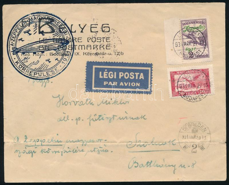Leírás: 1931 Zeppelin magyarországi körrepülése légi levél ívszéli Zeppelin 2P + Repülő 20f bérmentesítéssel, levélzáróval "BUDAPEST" - "DEBRECEN" - "SZOLNOK" (20.000)