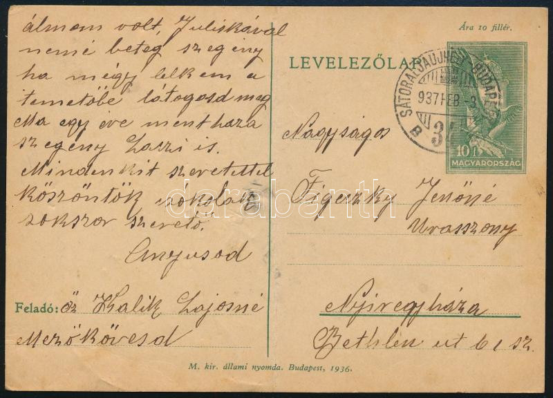 1937 Díjjegyes levelezőlap SÁTORALJAÚJHELY - BUDAPEST vasúti bélyegzés... https://www.darabanth.com/hu/518-Filatelia-kepeslap-numizmatika-mutargy-konyv-papirregiseg-ekszer-aukcio/524.0/Magyar-filatelia-es-postatortenet/Pengo-idoszak-1926-1944~46/1937-Dijjegyes-levelezolap-SATORALJAUJHELY-BUDAPEST-vasuti-belyegzessel~II3514689