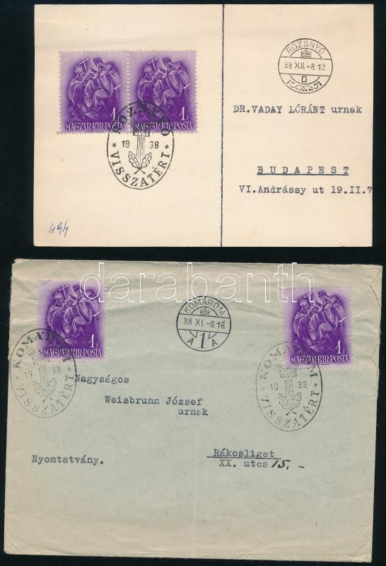 1938 18 db felvidéki város VISSZATÉRT bélyegzések https://www.darabanth.com/hu/518-Filatelia-kepeslap-numizmatika-mutargy-konyv-papirregiseg-ekszer-aukcio/524.0/Magyar-filatelia-es-postatortenet/Pengo-idoszak-1926-1944~46/1938-18-db-felvideki-varos-VISSZATERT-belyegzesek~II3517833