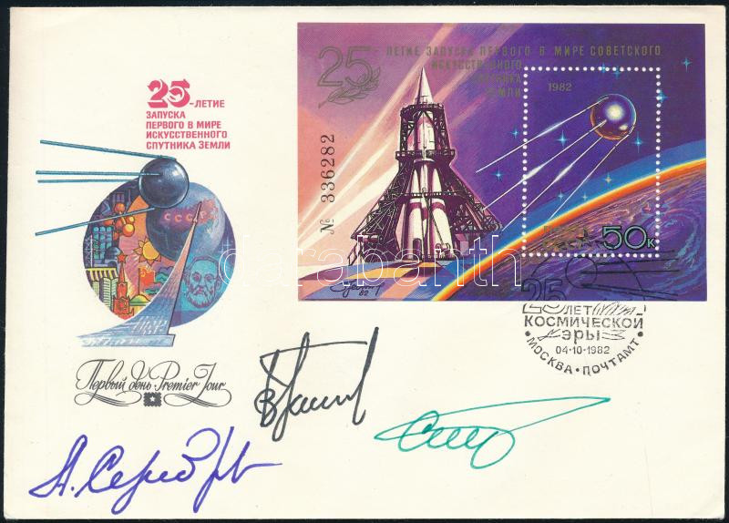 Leírás: Alekszandr Szerebrov (1944-2013), Vlagyimir Tyitov (1947- ) és Gennagyij Sztrekalov (1940-2004) szovjet űrhajósok aláírásai emlékborítékon / Signatures of Aleksandr Serebrov (1944-2013), Vladimir Titov (1947- ) and Gennadiy Strekalov (1940-2004) Soviet astronauts on envelope