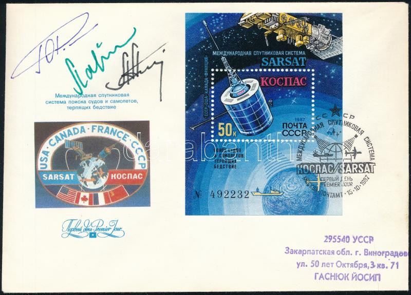 Leírás: Jurij Viktorovics Romanyenko (1944- ), Alekszandr Lavejkin (1951- ), Alekszandr Viktorenko (1947- ) szovjet űrhajósok aláírásai emlékborítékon / Signatures of Yuriy Viktorovich Romanenko (1944- ), Aleksandr Laveykin (1951- ), Aleksandr Viktorenko (1947- ) Soviet astronauts on envelope