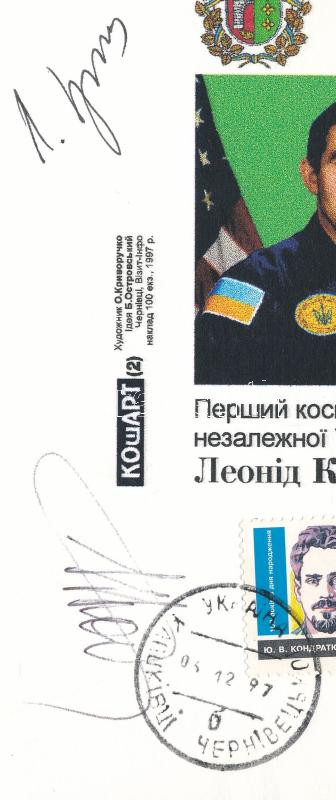 Leonyid Kadenyuk (1951-2018) ukrán űrhajós és Leonyid Kucsma (1938- ) volt ukrán elnök aláírásai levelezőlapon / Signatures of Leonid Kadeniuk (1951- ) Ukrainian astronaut and Leonid Kuchma (1938- ) former Ukrainian president on postcard