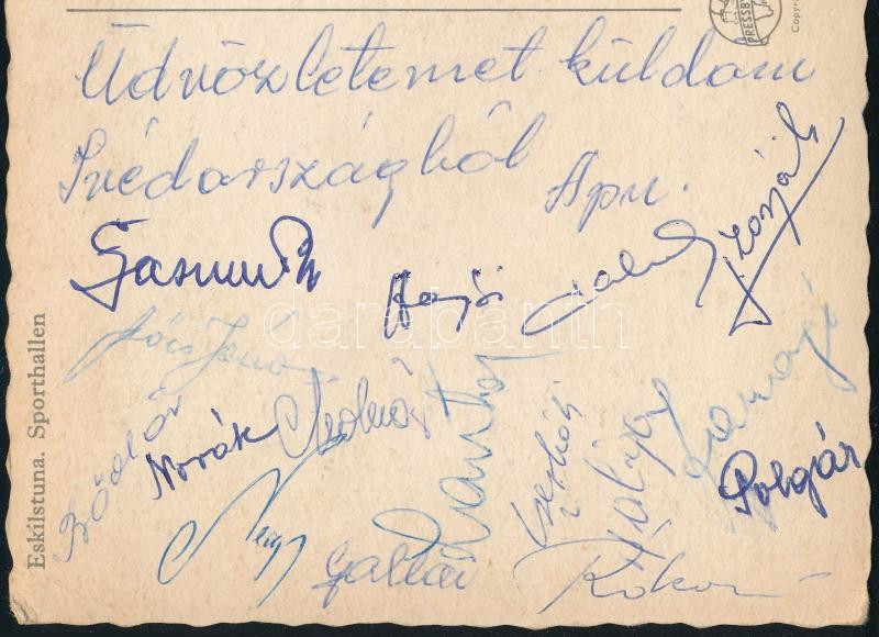 Leírás: ca 1960 Magyar labdarúgó B válogatott tagjai által aláírt képeslap Svédországból: Lantos, Faragó, Bödör, Szűcs, Molnár, Rákosi, stb / Autograph of the Hungarian football B team