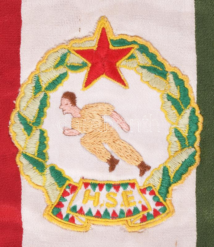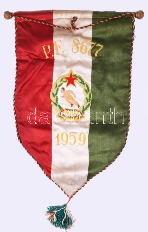 Leírás: 1959 Honvéd SE (HSE) "P.F. 8677" feliratú hímzett sportzászló, hátoldalán kisebb folttal, 38x24 cm