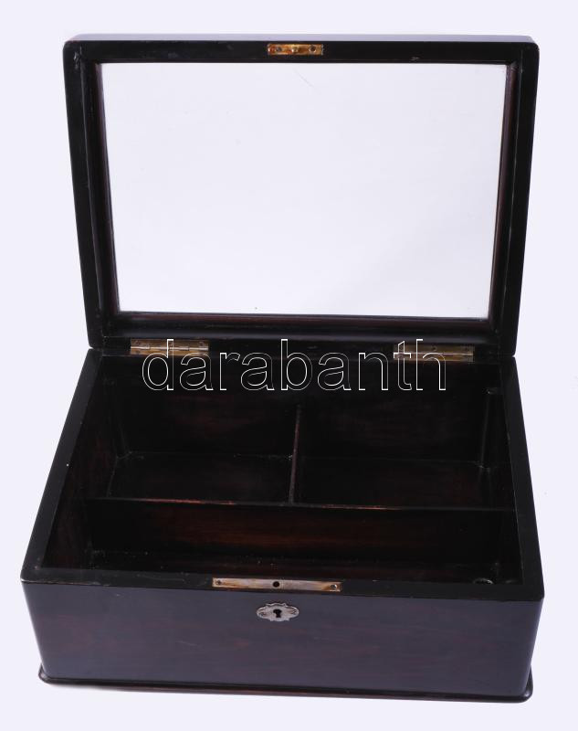 Leírás: Régi fa díszdoboz, üveglap betéttel, zárja nem működik, 22x3x13 cm