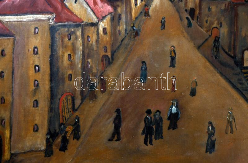 Leírás: Városi látkép toronyórával. Olaj, vászon, fa keretben, beépített mechanikus óraszerkezettel. hátulján deszka merevítéssel. XX. sz. eleje.