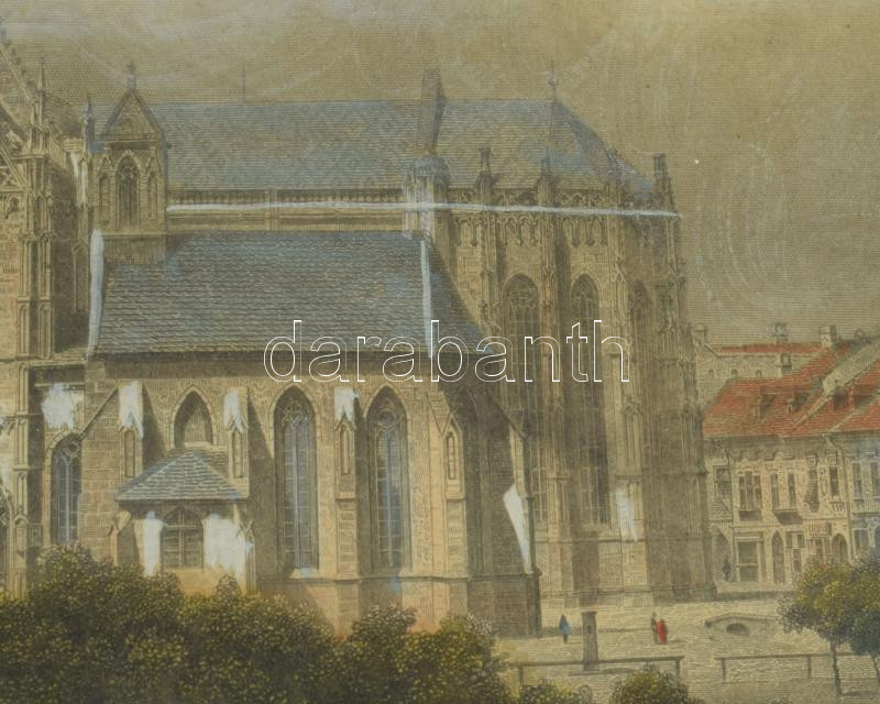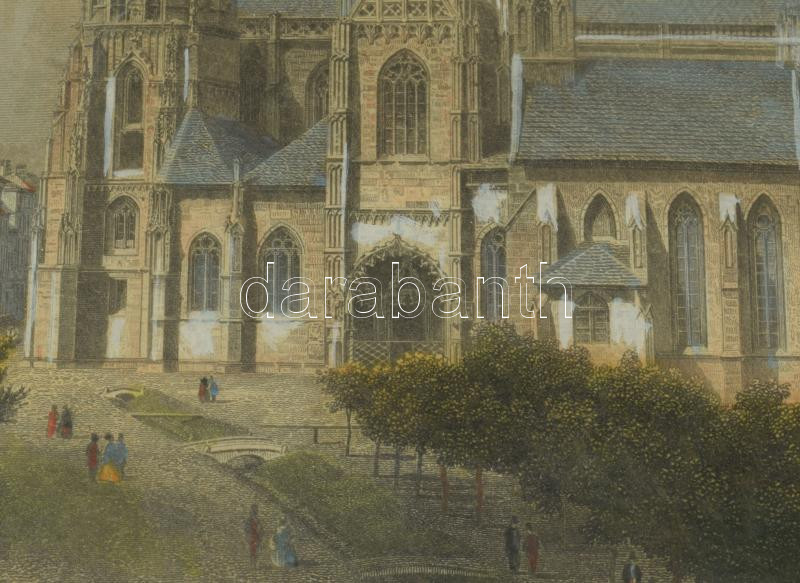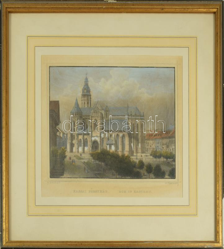 Leírás: Ludwig Rohbock (1820-1883)-Johann Poppel (1807-1882): Kassai főegyház (Dom in Kaschau), színezett acélmetszet, papír, jelzett a metszeten, paszpartuban, sérült üvegezett fakeretben, 12x16,5 cm, keret: 24x28 cm