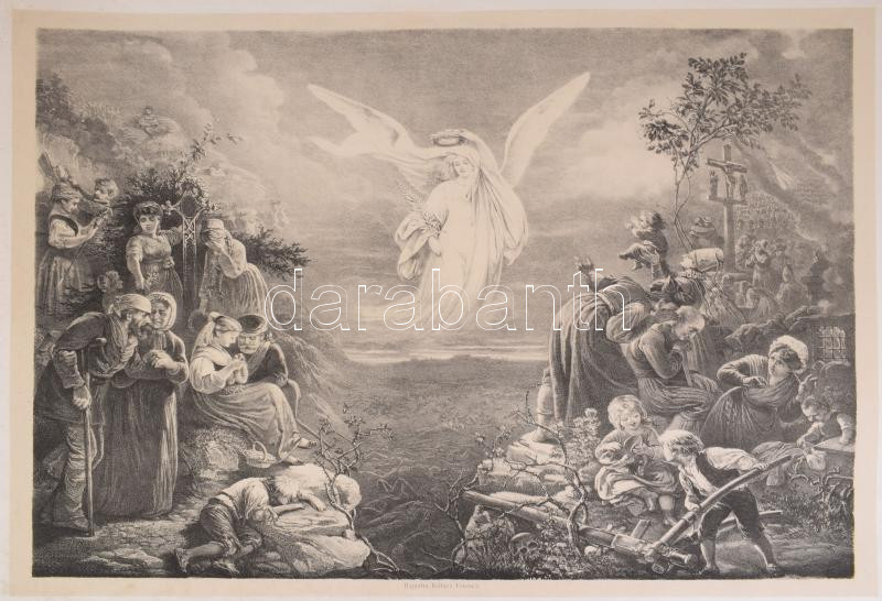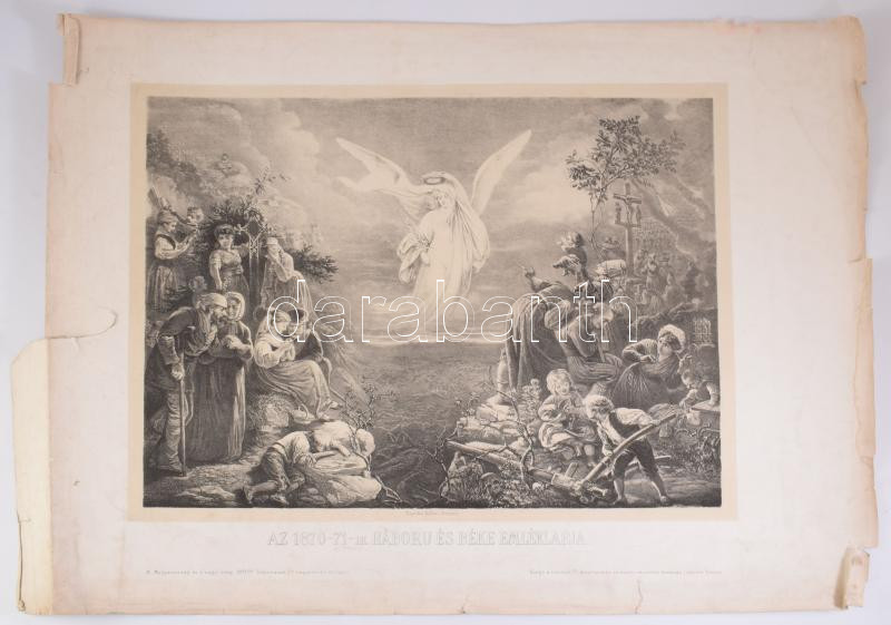 cca 1871 Kollarz Ferenc (1825-1894): Az 1870-71-ik háború és béke emléklapja, rajzolta: - -, "Magyarország és a nagy világ" 1871-diki folyamának 1-ső negyedéves műlapja, Pest, Deutsch Testvérek-ny., papír, litográfia, sérült, foltos, gyűrődéssel, hajtásnyommal, 40x51 cm, lap: 55x74 cm
