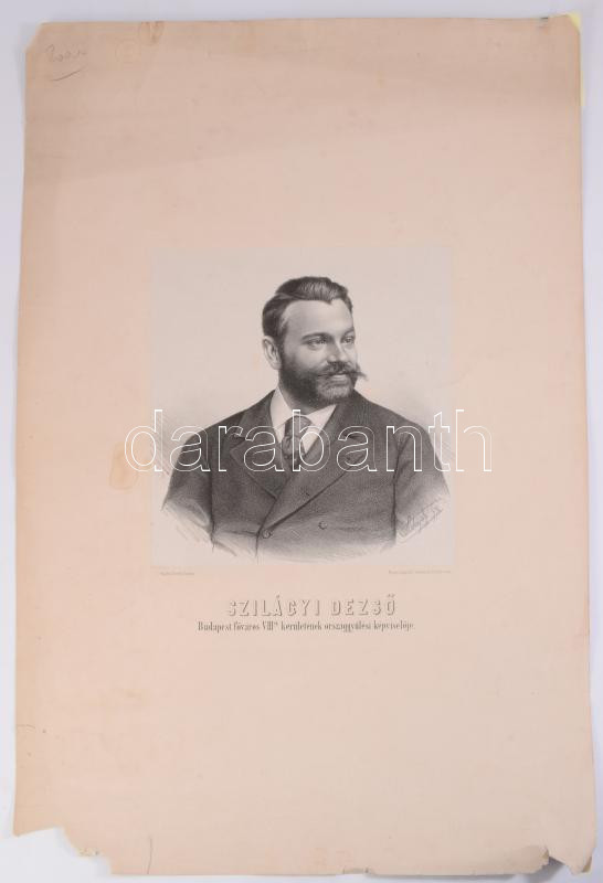 cca 1880 Szilágyi Dezső (1840-1901) jogász, politikus, igazságügy miniszter portréja, kiadta: Vereby Soma, Bp., Légrády-ny., papír, litográfia, foltos, sérült kartonnal, 20,5x18,5 cm, lap: 55x35 cm