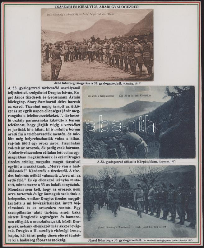 1916 The collection presenting the k.u.k. 33rd Arad Infantry Regiment consists of 6 original postcards with accompanying texts, on two panels. (The cards can be detached)