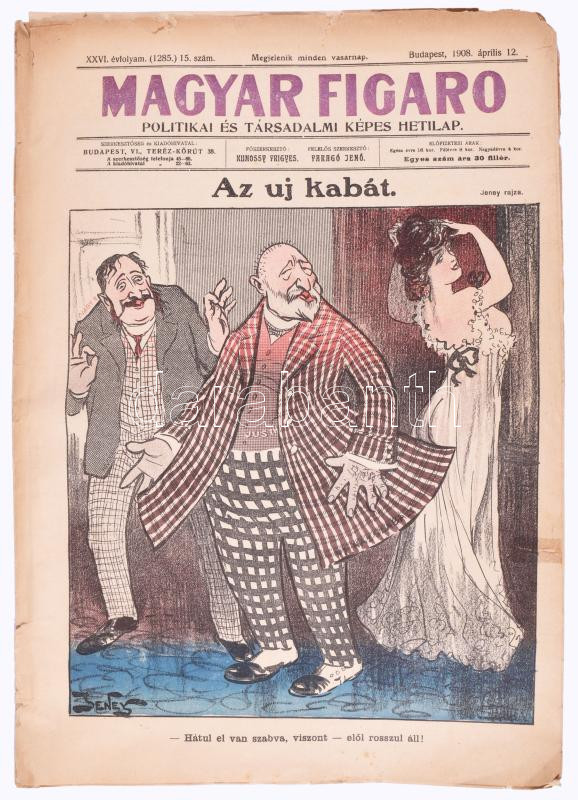 1908, A Magyar Figaro Politikai és Társadalmi Képes Hetilap XXVI. évfo... https://www.darabanth.com/hu/518-Filatelia-kepeslap-numizmatika-mutargy-konyv-papirregiseg-ekszer-aukcio/524.0/Mutargy-papirregiseg-egyeb/Nyomtatvanyok~77/1908-A-Magyar-Figaro-Politikai-es-Tarsadalmi-Kepes-Hetilap-XXVI-evfolyamanak-15-szama-12p~II3518850