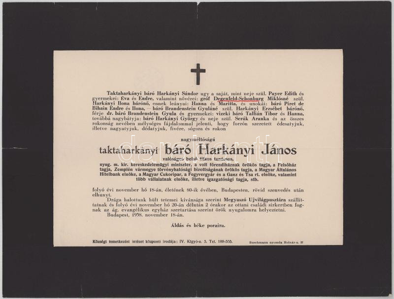 1938 Bp., taktaharkányi báró Harkányi János (1859-1938) valóságos belső titkos tanácsos, főrendiházi és felsőházi tag, kereskedelemügyi miniszter, a Magyar Általános Hitelbank, a Ganz és Társa Rt., valamint több vállalat elnöke halotti értesítője, kisebb lapszéli sérülésekkel, 23x30 cm