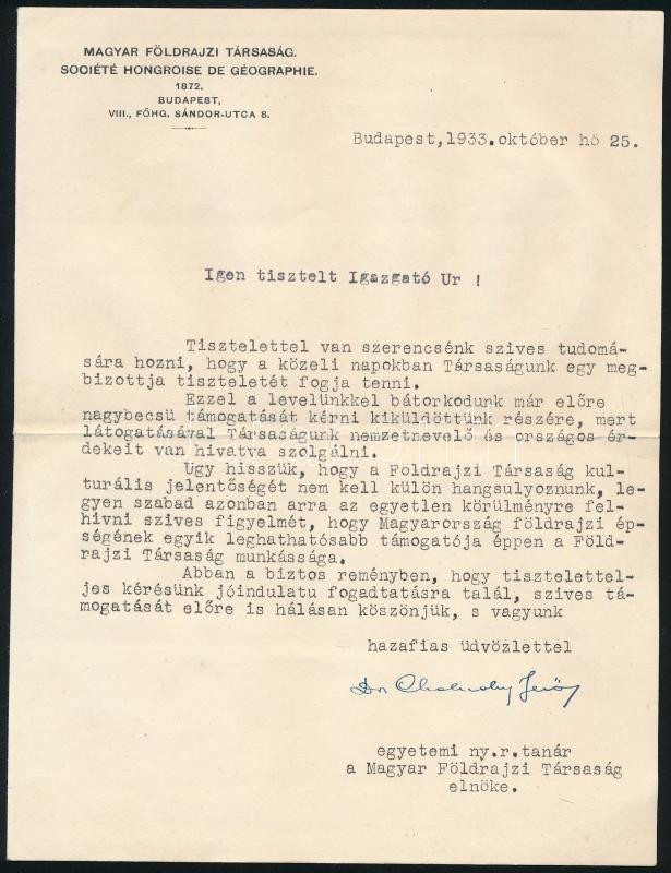 1933 Cholnoky Jenő (1870-1950) földrajztudós autográf aláírással ellátott levele a Magyar Földrajzi Társaságot bemutató, ajánló levelén.