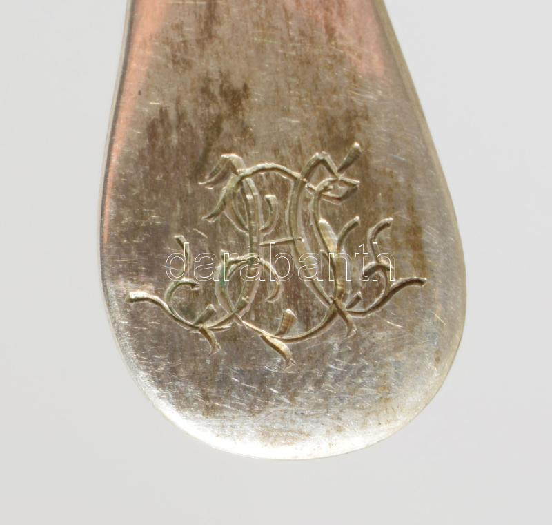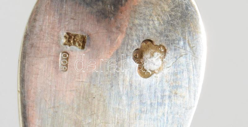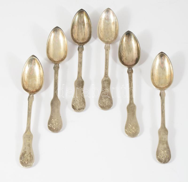 6 db ezüst mokkás kanál. Jelzett: Pest, 1872-1937 közötti fémjel, 800 ezrelékes ezüst, mesterjegyes, nettó 73g, 11 cm