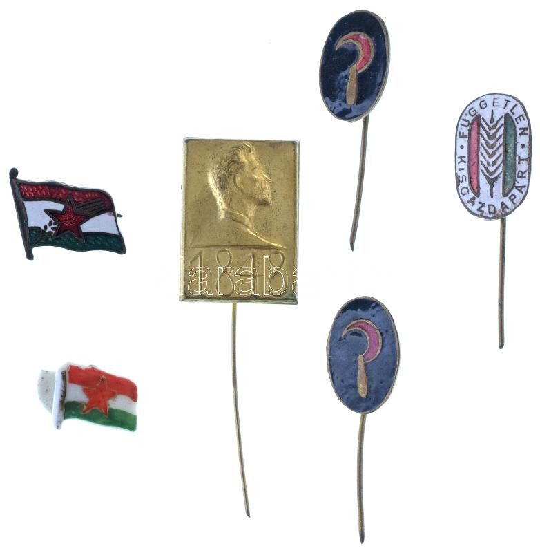 1930-1950 k. "Független Kisgazdapárt (FKGP)" zománcozott bronz jelvény + 1942. "1848" a Magyar Történelmi Emlékbizottság felkérésére Pátzay Pál által tervezett, Petőfi Sándort ábrázoló bronz jelvény (26x18mm) + 1947 k. "Nemzeti Parasztpárt (NPP)" zománcozott bronz jelvény + 1950 k. "Magyar Dolgozók Pártja (MDP)" zománcozott bronz jelvény + 1950 k. "Magyar Dolgozók Pártja (MDP)" fehér színű, festett bakelit gomblyukjelvény (sérült) T:XF,VF zománchibák