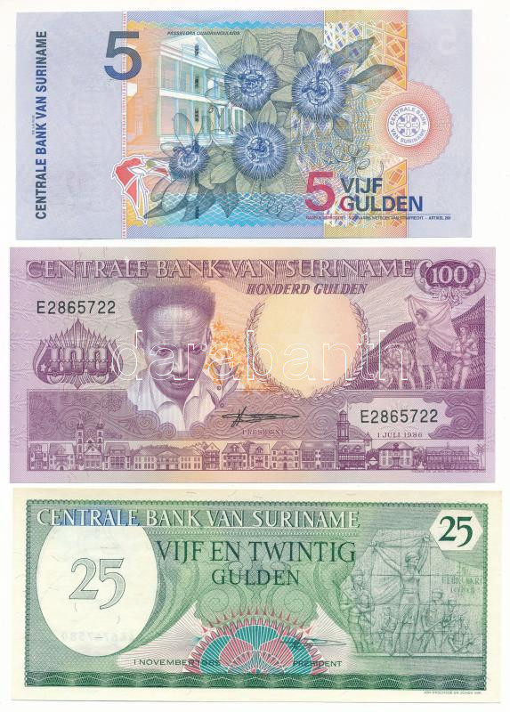 Suriname 2000. 5 Guld... https://www.darabanth.com/hu/518-Filatelia-kepeslap-numizmatika-mutargy-konyv-papirregiseg-ekszer-aukcio/524.0/Numizmatika/Kulfoldi-bankjegyek~889/Suriname-2000-5G-plus-1985-25G-plus-1986-100G-T-AUSuriname-2000-5-Gulden-plus-1985-25-Gulden-plus-1986~II3517328