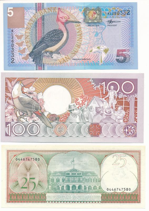 Suriname 2000. 5 Gulden + 1985. 25 Gulden + 1986. 100 Gulden C:AU