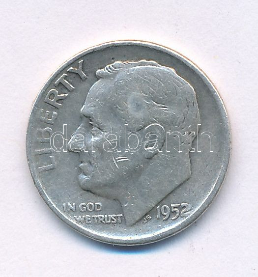USA 1952... https://www.darabanth.com/hu/518-Filatelia-kepeslap-numizmatika-mutargy-konyv-papirregiseg-ekszer-aukcio/524.0/Numizmatika/Kulfoldi-fem-es-ezustpenzek~890/Amerikai-Egyesult-Allamok-1952-1d-10c-Ag-Roosevelt-T-VFUSA-1952-1-Dime-10-Cents-Ag~II3518953