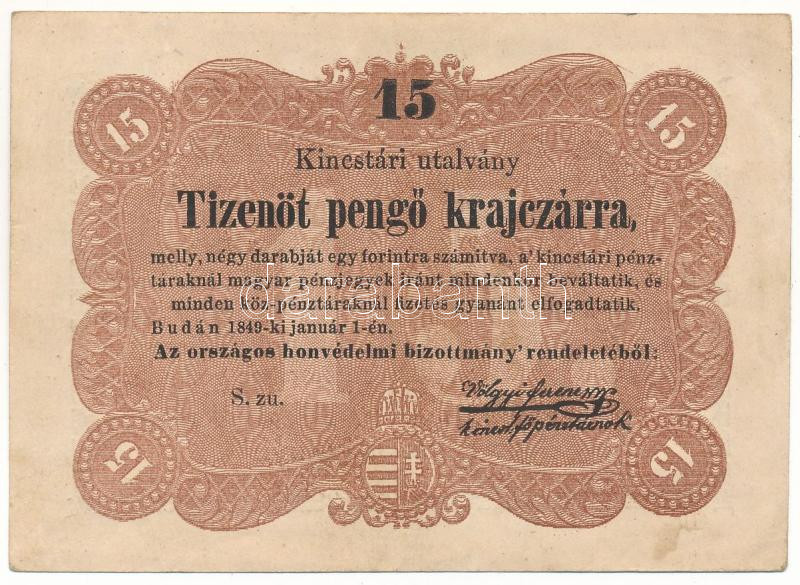 1849. 15kr "Kossuth banknote", with "Joós Elek Kis-Borozsnyó, Háromszék" overprint on the backside. Elek Joós (1832-1916) was a member of a noble family from Kisborosnyó (today: Boroşneu Mic). According to the sources found, Elek Joós served as a fireman in the 1848-49 revolution. Also, he had a distillery and a cattle feedlot in the village. On March 15, 1896, the Hitel és Fillérbank was established, of which he was the founding president, and he was also the owner of 450-700 acres of farmland and even more forests. On August 30, 1916, during the attack without a declaration of war, he was executed by Romanian soldiers. C:F nice paper