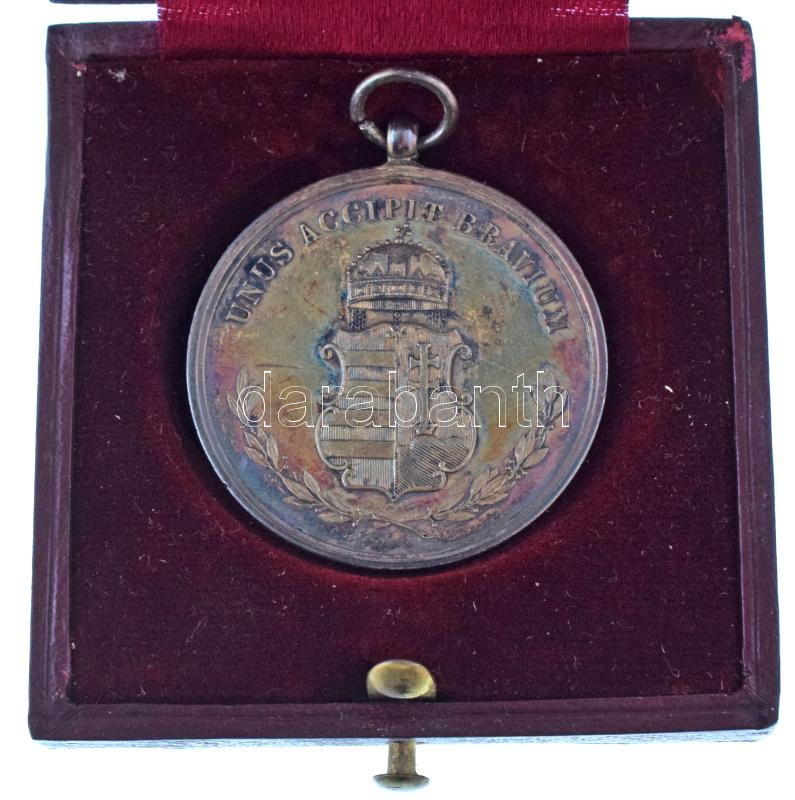 1900 k. "A kalocsai Szent István Jezsuita Gimnázium emlékérme" kétoldalas, peremén jelzett Ag emlékérem füllel, mellszalag nélkül, eredeti "IHS" dísztokban "GYMNASIUM SOCIETATIS JESU AD S. STEPHANUM - IHS - COLOCAE / UNUS ACCIPIT BRAVIUM" (18,01g/40mm) T:AU patina