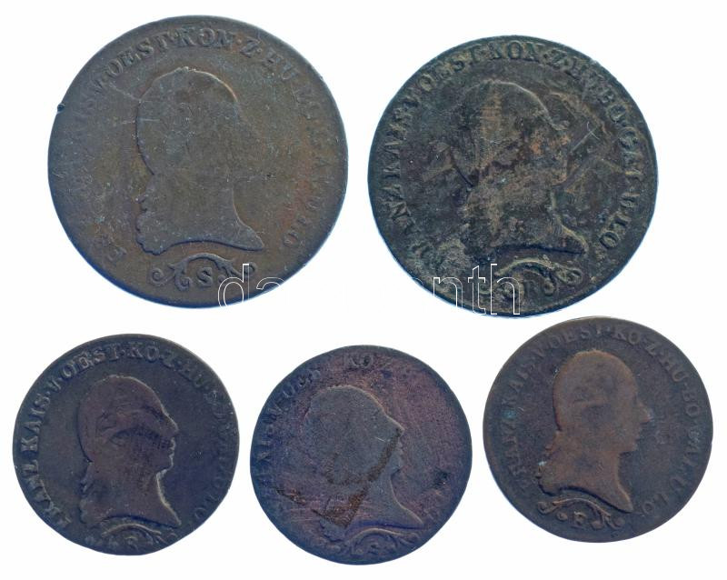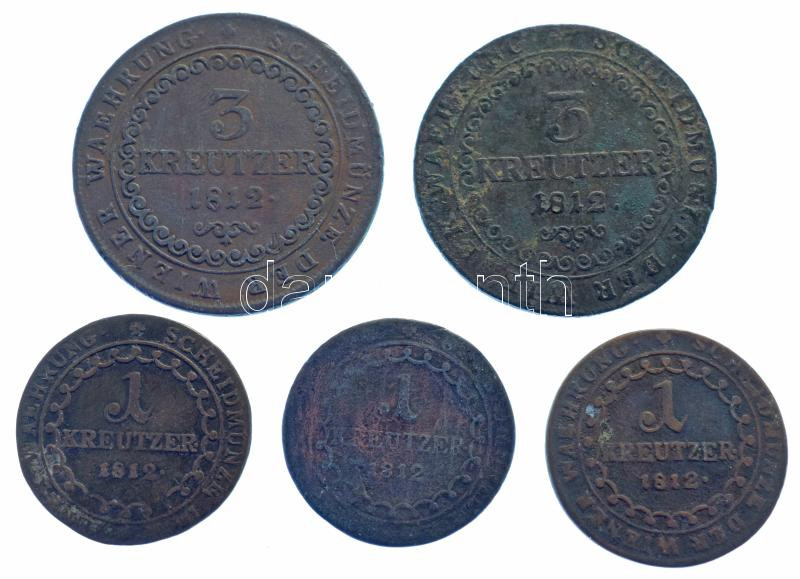 Leírás: 1812B-E-S 1kr Cu "I. Ferenc" (3xklf) + 1812S-B 3kr Cu "I. Ferenc" (2xklf) T:VF-VG patina, karc, ph.