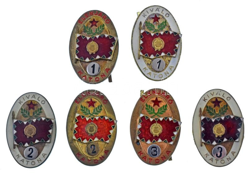 Leírás: 1970-1980 k. "Élenjáró Katona - 1-2-3. osztály " rátétes, műgyantás bronz Magyar Néphadsereg sapkajelvények (3xklf) (41x26mm) + "Kiváló Katona - 1-2-3. osztály " rátétes, műgyantás bronz Magyar Néphadsereg sapkajelvények (3xklf) (41x26mm) T:AU,XF