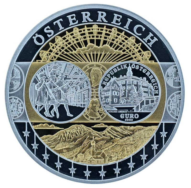 2002-2010 k. "Emlékérem az euróövezet országainak közös valutájáról - Ausztria" aranyozott, ezüstözött Cu-Ni emlékérem kapszulában, tanúsítvánnyal (35mm) T:PP