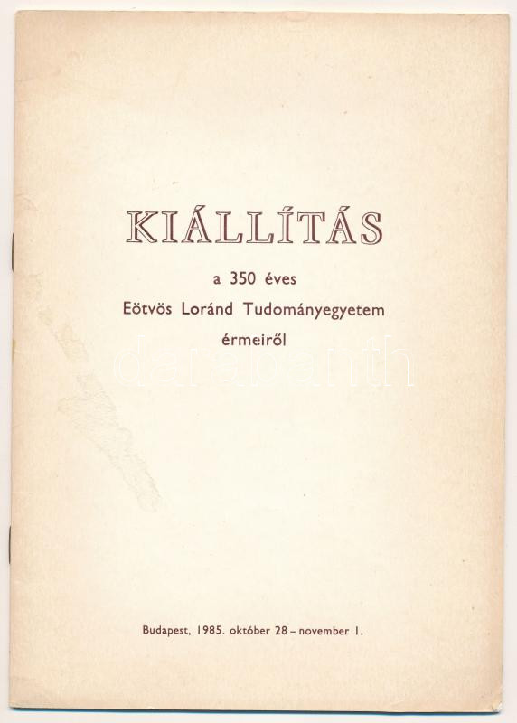 Kiállítás a 350 éves Eötvös Loránd Tudományegyetem érmeiről. Budapest,... https://www.darabanth.com/hu/518-Filatelia-kepeslap-numizmatika-mutargy-konyv-papirregiseg-ekszer-aukcio/524.0/Numizmatika/Numizmatikai-irodalom~877/Kiallitas-a-350-eves-Eotvos-Lorand-Tudomanyegyetem-ermeirol-Budapest-1985-Hasznalt-allapotban~II3514155