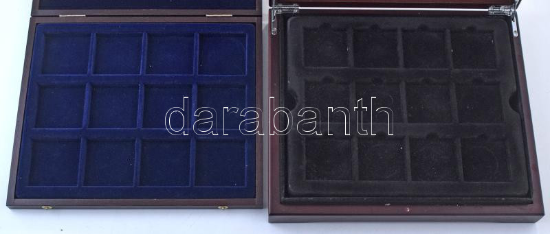 Fa érmetartó kazetta bársonybéléssel, 1db beépített és 2db kivehető tálcával, összesen 27db ~49x49mm-es férőhellyel (külső méretek: ~290x250x45mm) + fa érmetartó kazetta bársonybéléssel 1db beépített tálcával és 12db ~54x54mm-es férőhellyel (külső méretek: ~270x230x25mm). Használt, de jó állapotban