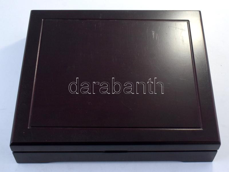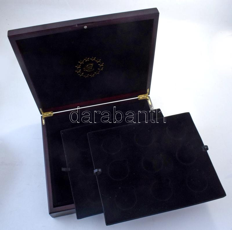 Mahagóni fa érmetartó kazetta bársonybéléssel, 1db beépített + 2db kivehető tálcával, összesen 24db ~46mm-es és 1db ~207x148mm-es férőhellyel. Használt, de jó állapotban (külső méretek: ~305x268x65mm)