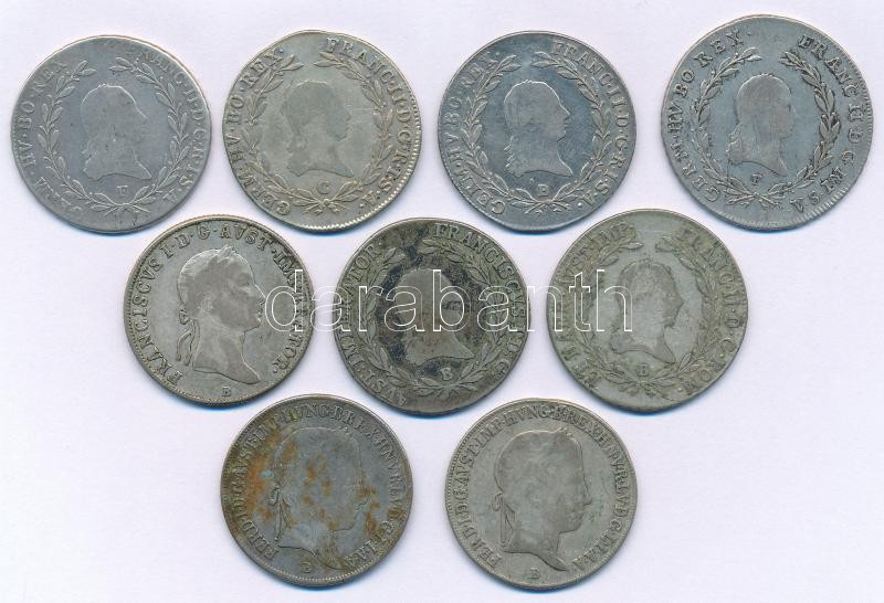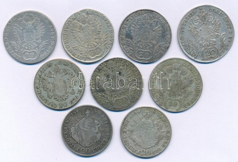 Leírás: 1795-1848. Kilenc darabos magyar és osztrák krajcár tétel, mindegyik 20kr névérték és különféle évjárat vagy verdejel, benne: 1795F, 1803B, 1803C, 1804F, 1806B, 1811B, 1835B, 1846B, 1848B T:XF-VF