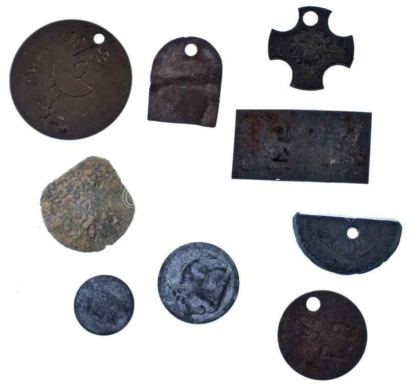 Leírás: Vegyes, 9db-os bárcatétel, közte: "ZJVS" "42" jelzéssel kereszt alakú Cu bárca + "István téglagyár" bronz bárca + "0.7" sorszámú bronz bárca + "19/33" orvosi bárca T:VF-G