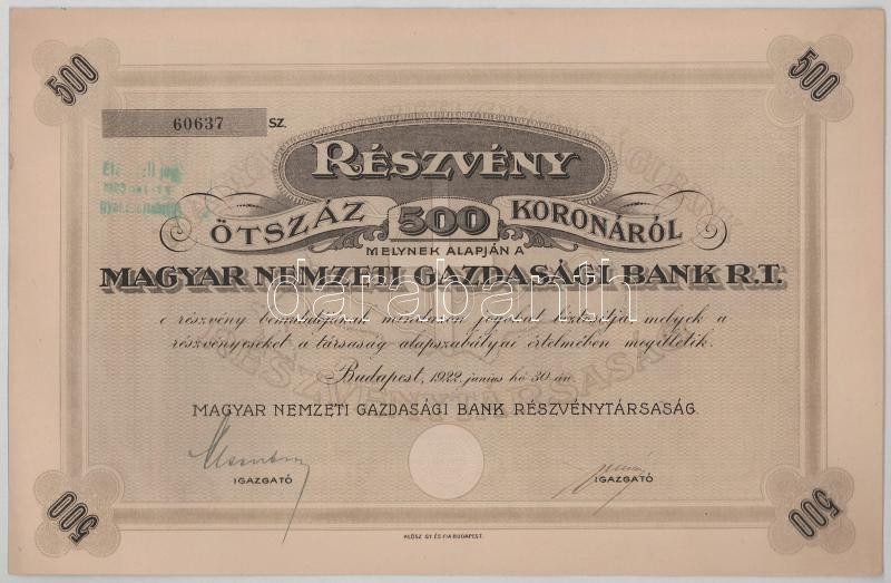1922. Budapest "Magyar Nemzeti Gazdasági Bank R.T." részvénye 500K-ról... https://www.darabanth.com/hu/518-Filatelia-kepeslap-numizmatika-mutargy-konyv-papirregiseg-ekszer-aukcio/524.0/Numizmatika/Reszvenyek-es-sorsjegyek~880/1922-Budapest-Magyar-Nemzeti-Gazdasagi-Bank-RT-reszvenye-500K-rol-szelvenyekkel-~II3501582