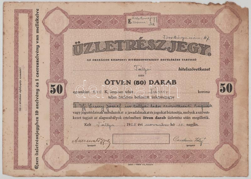 Leírás: 1925. Tállya "Tállyai Hitelszövetkezet " ötven darab névre szóló üzletrészjegye egyben, összesen 10.000K-ról T:VG