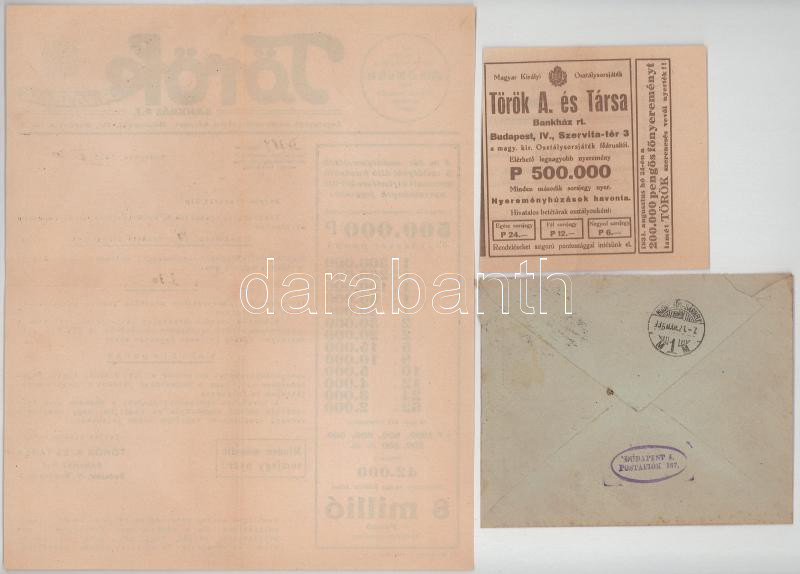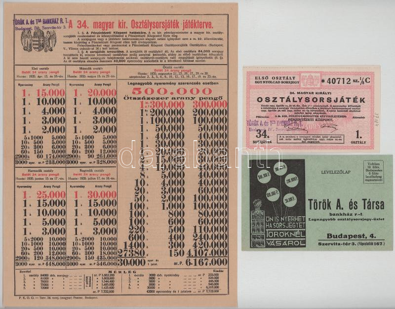 Leírás: 1935. "34. Magyar Királyi Osztálysorsjáték " 1. osztály egynyolcad sorsjegye "C", vízjeles papíron, a "Török Bankház Rt." bélyegzőjével, felbélyegzett borítékkal, a cég levelével, játéktervével és tájékoztatójával, valamint a befizetésről szóló elismervénnyel T:AU