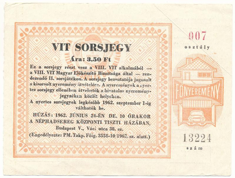 1962. Budapest "VIT (Világifjúsági Találkozó)" sorsjegy "007 osztály, ... https://www.darabanth.com/hu/518-Filatelia-kepeslap-numizmatika-mutargy-konyv-papirregiseg-ekszer-aukcio/524.0/Numizmatika/Reszvenyek-es-sorsjegyek~880/1962-Budapest-VIT-Vilagifjusagi-Talalkozo-sorsjegy-007-osztaly-13224-T-F-szep-papir~II3521467