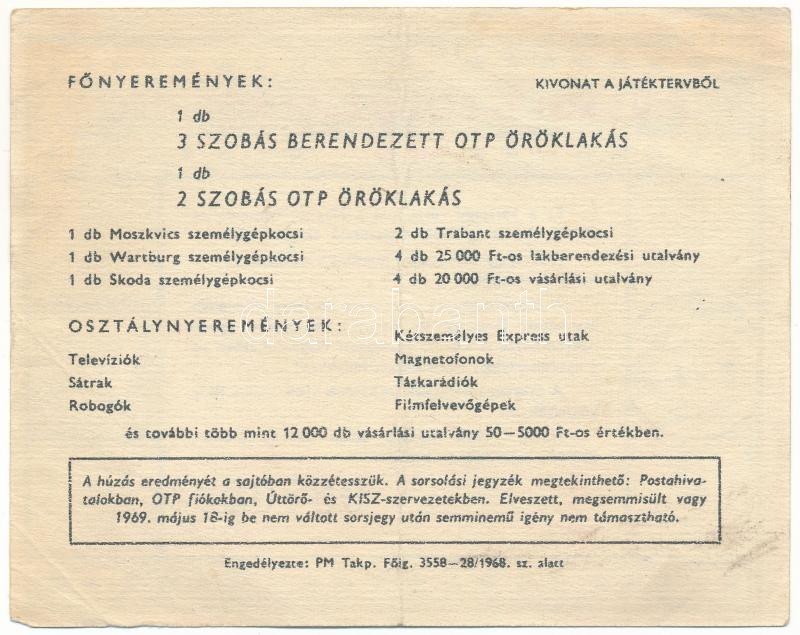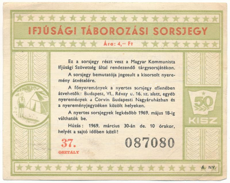 1969. "Ifjúsági Táborozási Sorsjegy" KISZ sorsjegy, 37. osztály "08708... https://www.darabanth.com/hu/518-Filatelia-kepeslap-numizmatika-mutargy-konyv-papirregiseg-ekszer-aukcio/524.0/Numizmatika/Reszvenyek-es-sorsjegyek~880/1969-Ifjusagi-Taborozasi-Sorsjegy-KISZ-sorsjegy-37-osztaly-087080-T-VF~II3521344