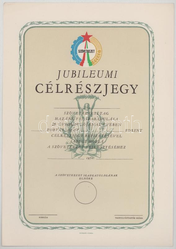 Leírás: 1970. "Szövetkezeti Jubileumi Célrészjegy " kitöltetlen T:AU