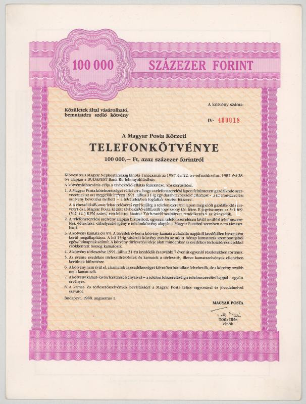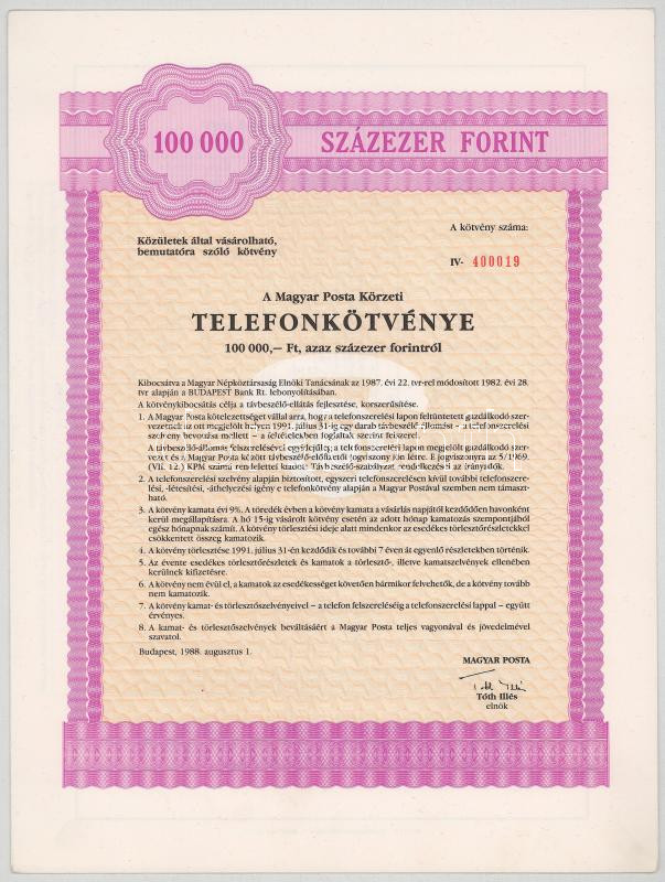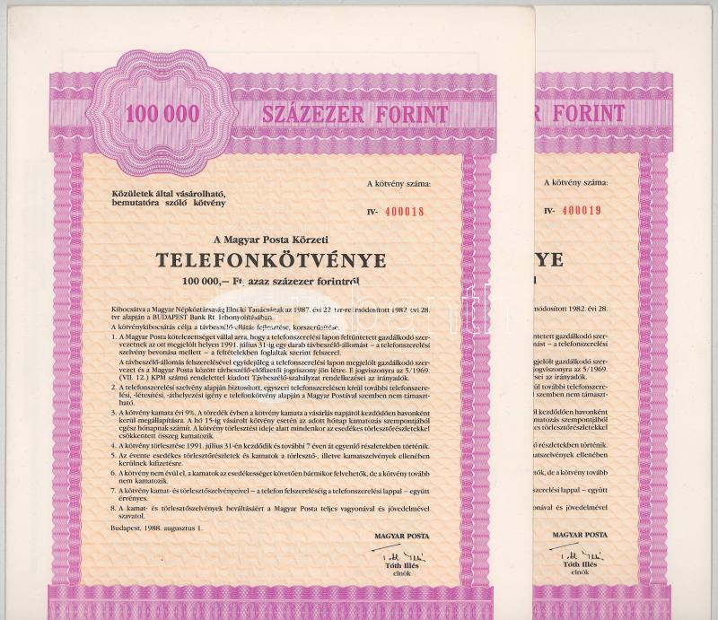 Leírás: 1988. Budapest "Magyar Posta Körzeti Telefonkötvénye " 100.000Ft-ról szelvényekkel (2x), sorszámkövetők "400018 - 400019" T:AU