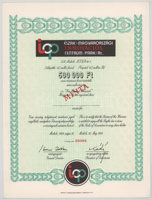 Leírás: 1989. Miskolc "Észak-Magyarországi Innovációs Centrum /Park/ Rt. " részvénye 500.000Ft-ról, "MINTA" bélyegzéssel, "000"-ás sorszámmal T:AU
