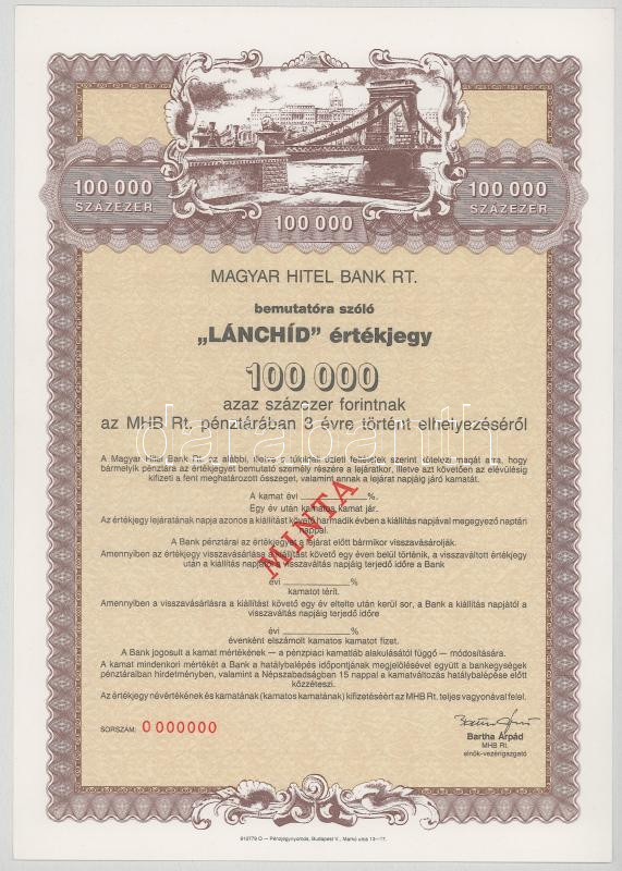 Leírás: 1990 k. "Magyar Hitel Bank Rt. - Lánchíd értékjegy" 100.000Ft-ról, "MINTA" bélyegzéssel, "000"-ás sorszámmal T:AU