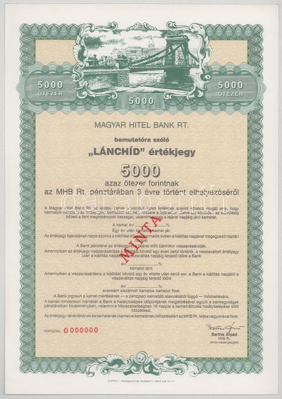 Leírás: 1990 k. "Magyar Hitel Bank Rt. - Lánchíd értékjegy" 5000Ft-ról, "MINTA" bélyegzéssel, "000"-ás sorszámmal T:AU